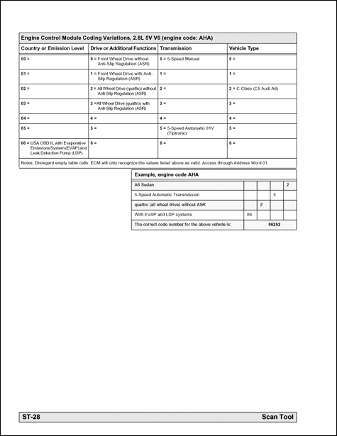 2.8L V6 (engine code: AHA) engine control module coding variations from Scan Tool section.