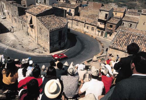 From The Speed Merchants. Pg. 180-181 The winning Alfa Romeo T33/3 of Nino Vaccarella rounds a corner in the town of Campofelice in front of a crowd of spectators sitting on a hillside grandstand.