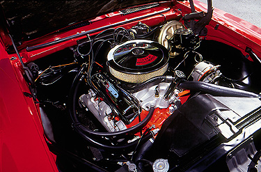 Z/28 engine compartment showing aluminum high-rise intake manifold and log style exhaust manifolds.