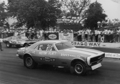 Chevrolet drag racers loved the Camaro for its big engines and light weight. This Camaro "funny car," the Dixie Twister, was actually a fiberglass body on a welded tubular frame. Here driver Huston Platt sticks it to Tasca Ford"s Single Overhead Camshaft 427.