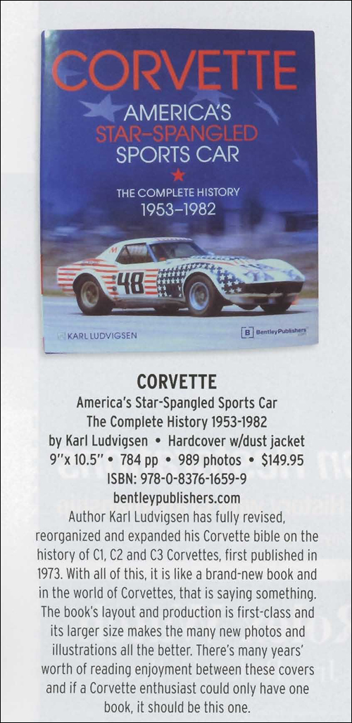 Author Karl Ludvigsen has fully revised, reorganized and expanded his Corvette bible on the history of the C1, C2 and C3 Corvettes, first published in 1973. With all of this, it is like a brand-new book and in the world of Corvettes, that is saying something. The book's layout and production is first-class and its larger size makes the many new photos and illustrations all the better. There's many years' worth of reading enjoyment between these covers and if a Corvette enthusiast could only have one book, it should be this one.