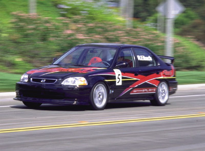 Purpose-built racecars, such as this 1996 Civic, can be made functional for the street. This version features an adjustable coil-over suspension system to vary ride height and quality. In the most extreme setting (three inches lower than stock) it looks great on the street. In the optimum handling setting, the car can run rings around European sports cars that carry three times the price.